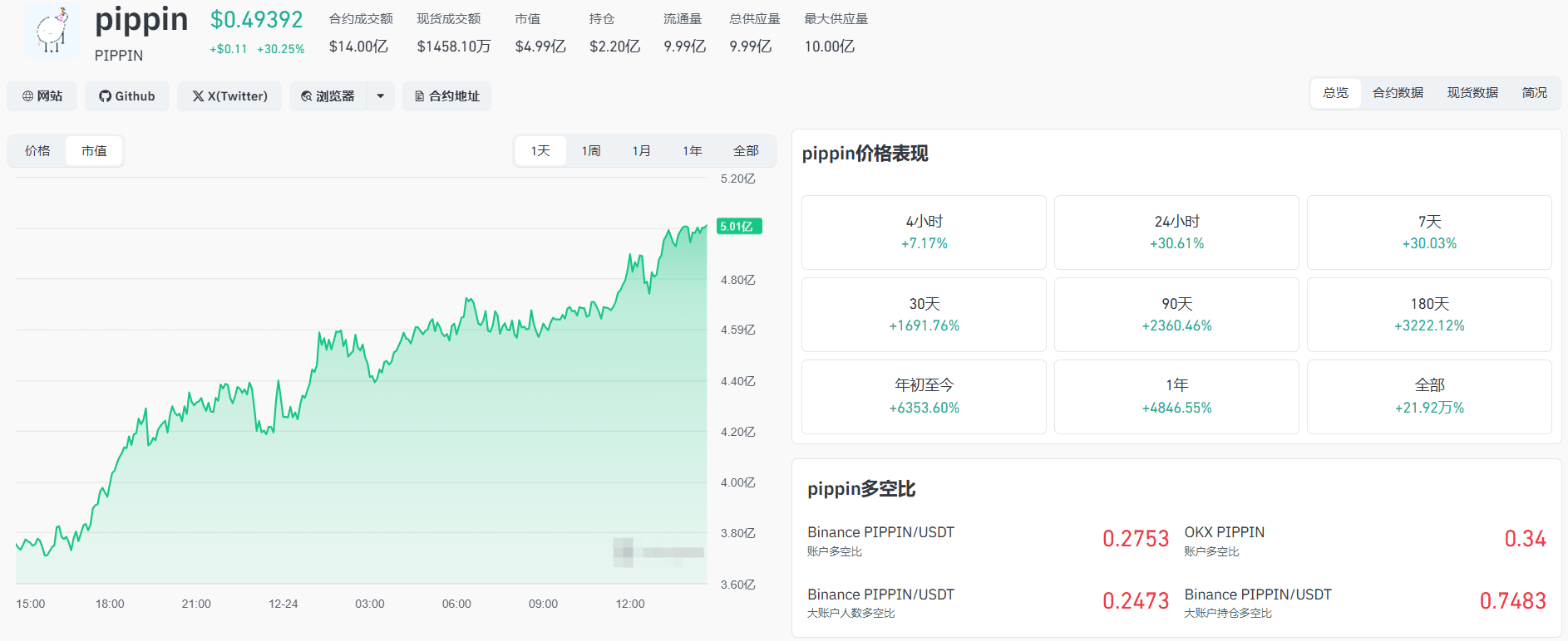 The market value of PIPPIN has reached 499 million USD, with circulation close to the total supply, indicating concentrated chips, making it easy to rally.