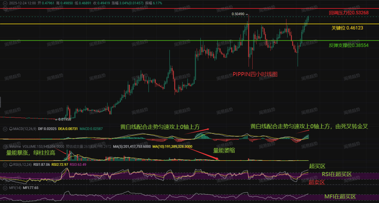 The outlook for PIPPIN is bullish, but don't chase high prices! The overbought indicator poses short-term risks, but the trend is king. A golden cross has formed, volume is in line, and shorts are crowded; this wave of increases is far from over.