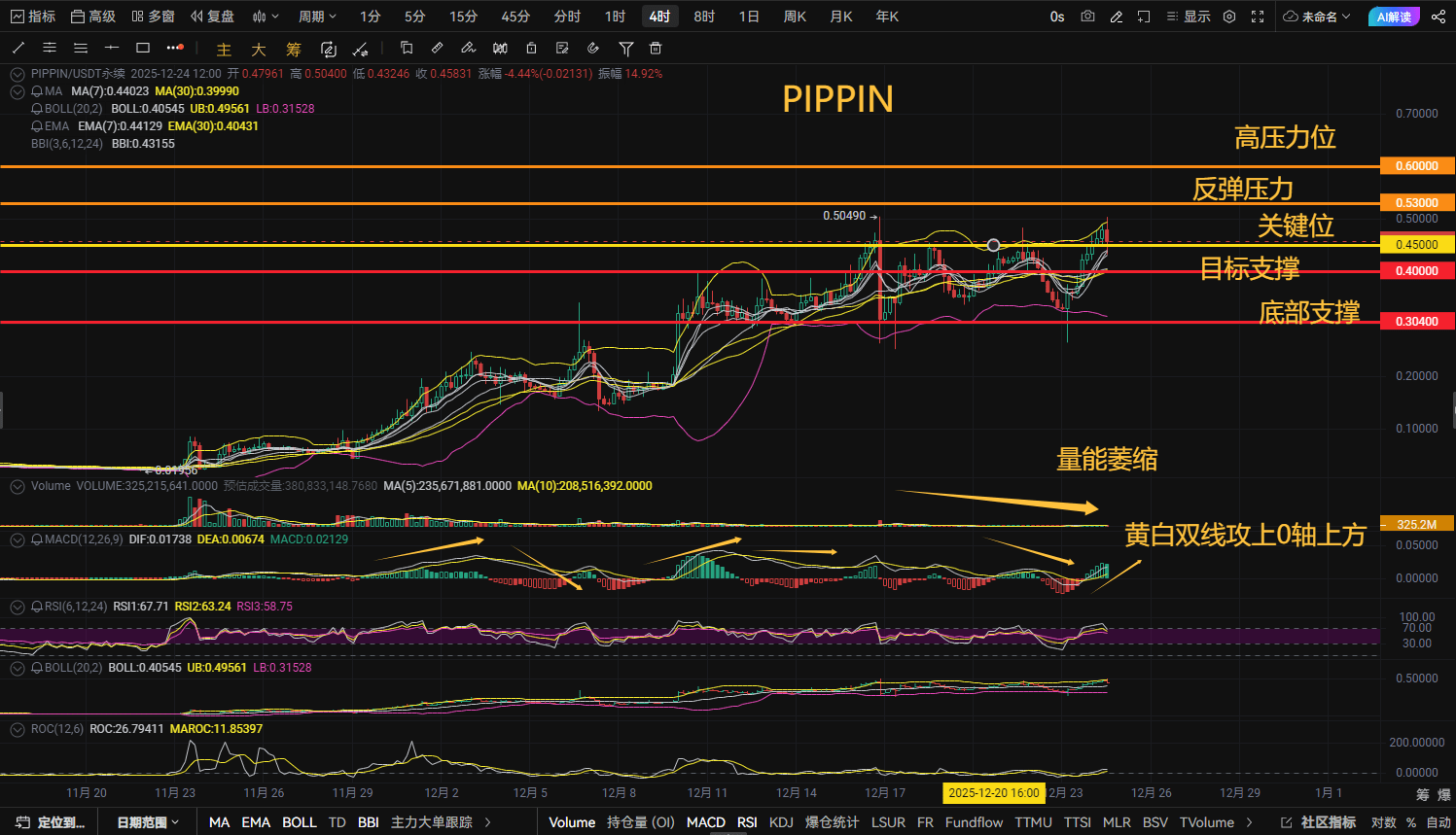 For those with no positions: don’t rush to act, wait for a volume breakout above 0.53 to test lightly; better to miss out than to make a wrong move!