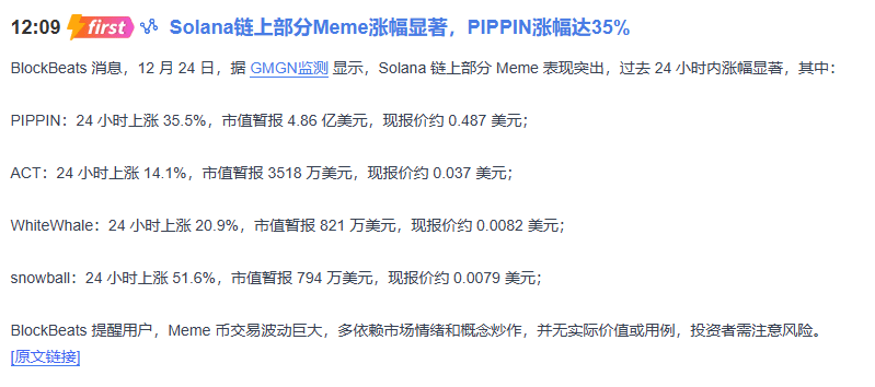 Today, the brightest star on the Solana chain undoubtedly belongs to $PIPPIN ! In the last 24 hours, it surged by 35.5%, with the market value skyrocketing to 486 million USD, and the price hitting 0.487 USD, with funds pouring in wildly and market sentiment soaring!