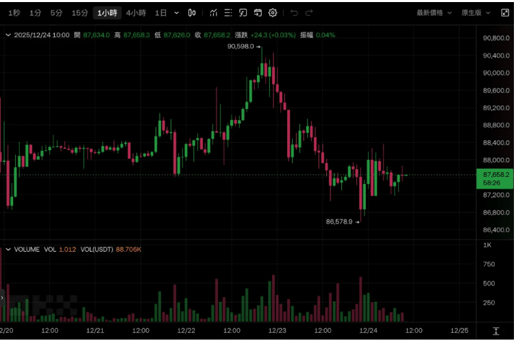 The crypto market before the Christmas holiday is really exhausting! BTC plunged right after the U.S. stock market opened last night, hitting a low of $86578. The flame of the bulls was extinguished again, and now it has shrunk back to the previous fluctuation range, reported at $87658. This market can be summarized as 'waiting for direction'. Once Christmas arrives, it is highly likely to remain flat in the range for a longer time.