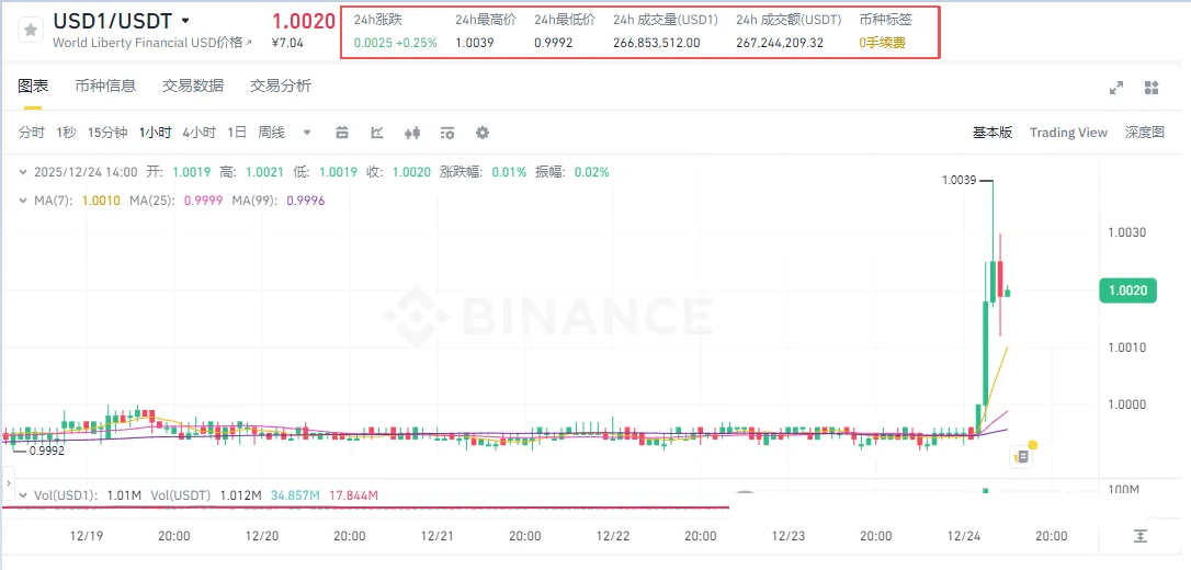 Among a bunch of meme coins, USD1 is considered a clear stream! Usually, the daily trading volume of USDT against USD1 is only over 10 million, today it surged directly to 260 million, and the K line even has a premium. The key is that the returns are enticing, starting investment at 50,000 U, annualized 20%, with an average monthly cost of about $800, which is already considered a very attractive stable choice in the current market environment, but the quota is limited, so act fast.