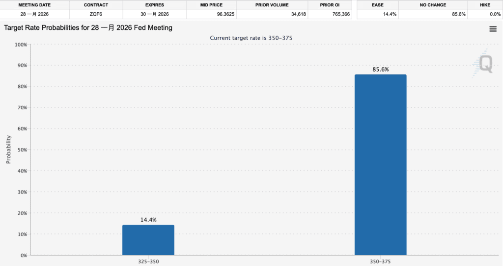 First, let's look at the macro background: there is absolutely no hope for the Fed to cut rates! CME FedWatch data shows that the probability of maintaining a 3.5%-3.75% interest rate in January has soared to 85.6%, while the probability of a rate cut is only 14.4%.
