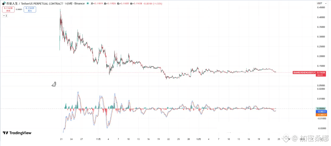 自带币安流量光环,17 号官方还在 APP 里明牌推送 “现货上新,这是测试币”,明显是为后续现货上所铺垫。从最高点 0.517 美元跌到现在 0.12 美元,深度回撤 + 长时间盘整,早期获利盘和不坚定筹码都被洗干净了,底部特别扎实,筹码结构也干净。