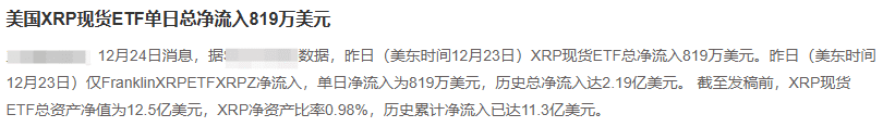 The data shows that XRP spot ETF funds continue to flow in but the scale is limited: a net inflow of 8.19 million dollars in a single day, with a historical total of 1.13 billion dollars. Total net asset value is 1.25 billion dollars, with a net asset ratio of only 0.98%, indicating moderate market participation. XRP remains a niche asset class in the traditional financial system.