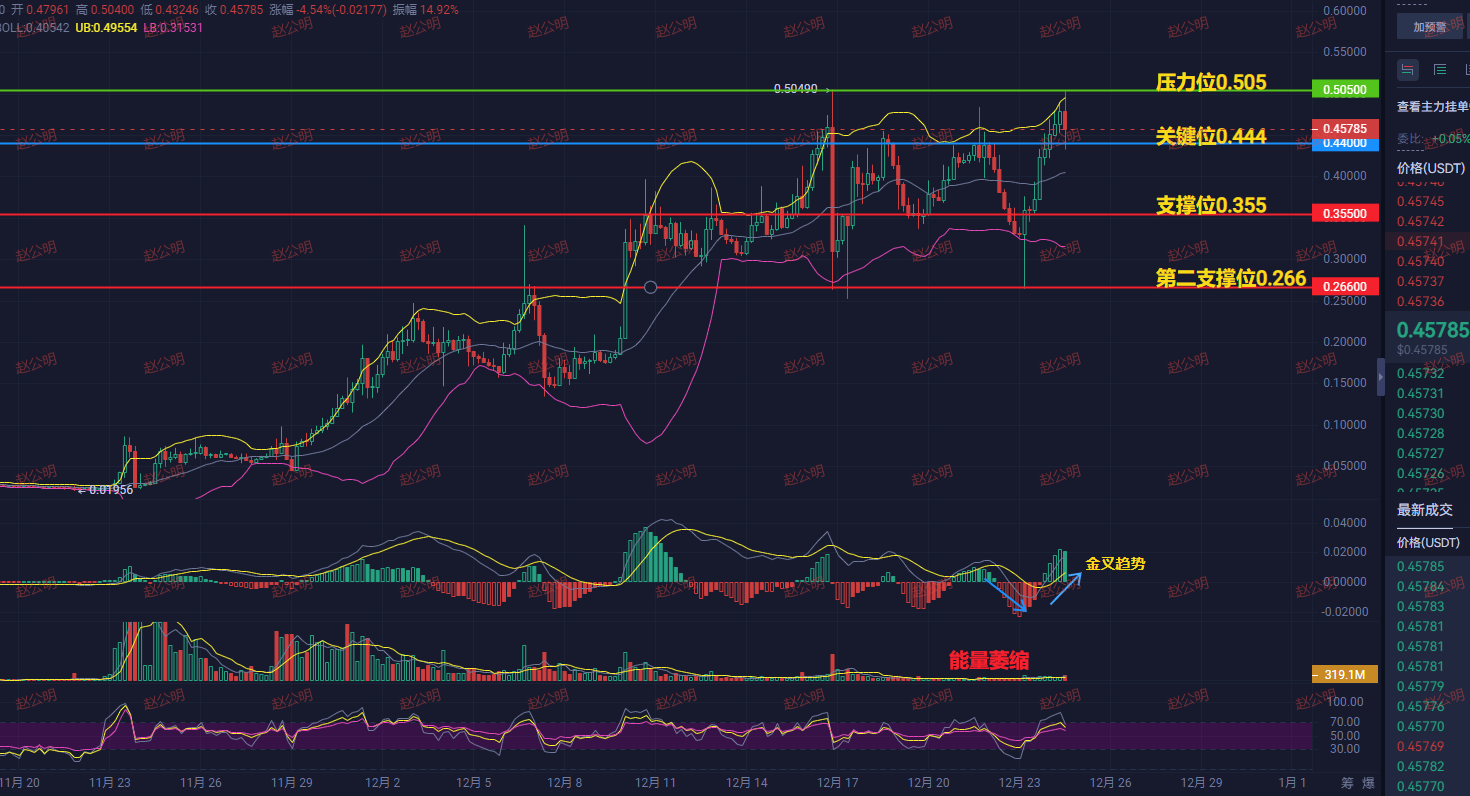 Key position: The upper 0.505 is a strong resistance level, and if the market maker pushes it here, they may be done. The lower 0.444 is a key level; if it breaks down, this wave of false prosperity will be declared over, directly targeting 0.355 or even 0.266.