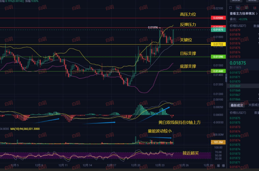Trend and price: The candlestick has shown a strong upward trend, with the latest price hitting $0.01875, which is an increase from the $0.01830 you mentioned, with a daily increase of over 8%! The momentum is strong. This is clearly a result of major funds entering the market.