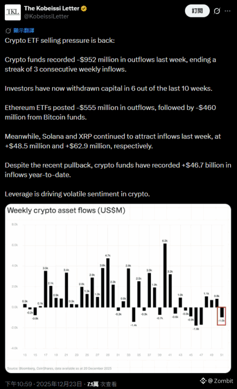 市場分析機構 The Kobeissi Letter 週二引用 CoinShares 的資料指出,全球加密貨幣投資基金在上週錄得 9.52 億美元的資金流出,投資人在近十週當中有六週都在撤出資金。該機構表示:「儘管近期出現回撤,加密貨幣基金今年以來的累計淨流入仍達 467 億美元。槓桿操作正在加劇加密市場情緒的波動。」