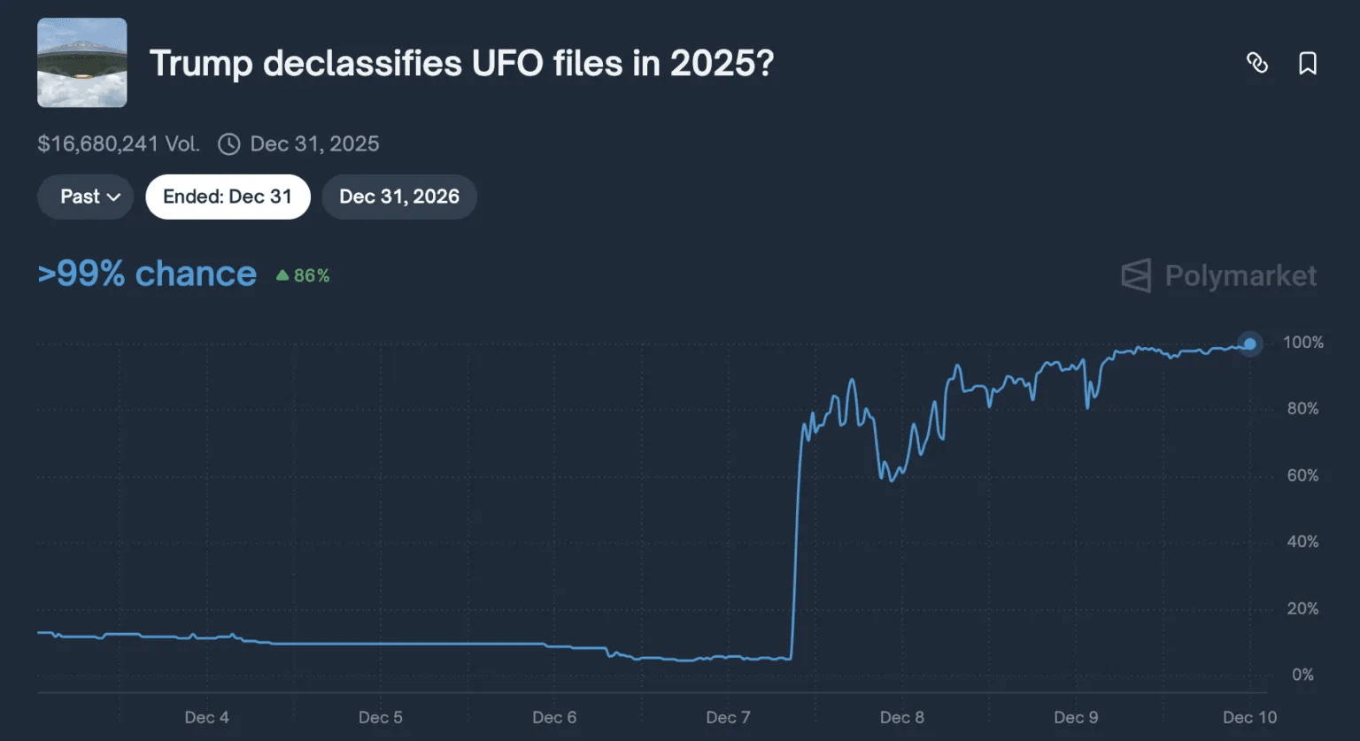 Theoretical risks have already transformed into bloody realities in 2025. The collapse of the UFO document decryption market is a typical case. This market was created in April 2025, inquiring whether the Trump administration would declassify UFO documents in 2025, with trading volume reaching $16 million and attracting numerous speculators. The manipulation process involved several carefully designed steps: whales first bought 'YES' shares at close to face value just before settlement, then launched attacks utilizing the UMA oracle system that Polymarket relies on.