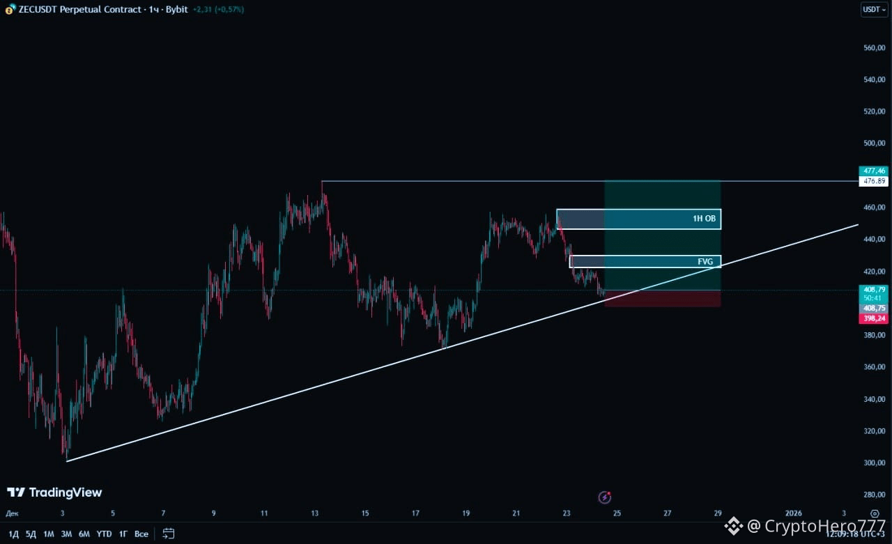 Текущая ситуация: $ZEC тестирует мощную кластерную поддержку $404-407. Эта зона объединяет несколько факторов силы: