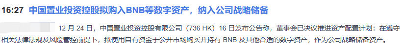 China Real Estate Investment Holding is set to buy BNB as a strategic reserve! This is not just a small retail move; the entry of company-level funds often implies a long-term value support. Once the news broke, the market did not immediately surge, indicating that the major players are also observing. They may be gradually accumulating shares with positive news rather than rushing to push the market up.