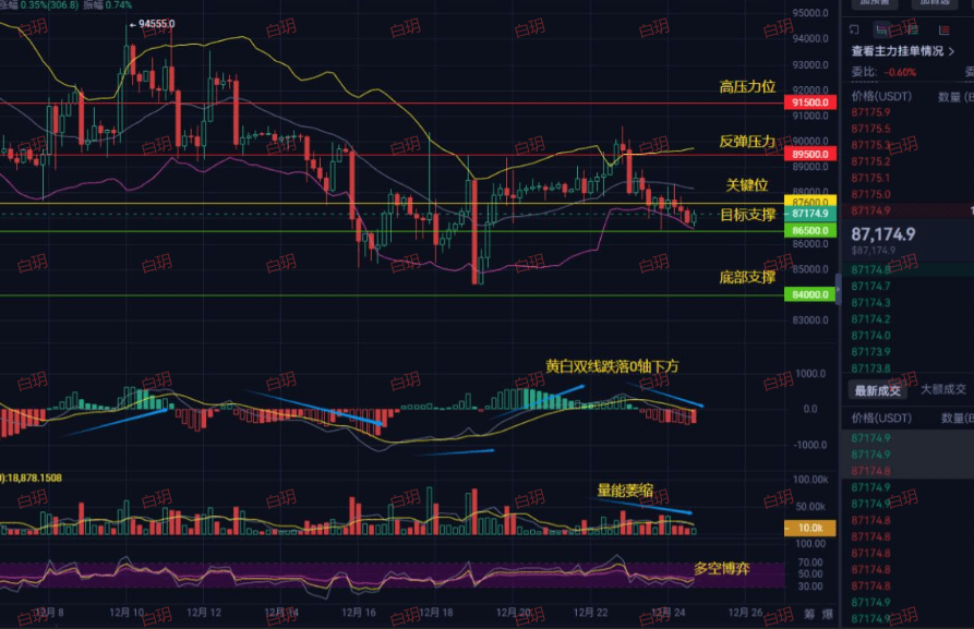 My personal opinion is: short-term speculation is intense, but the power of the 'nuclear bomb' may be greater. The technical adjustments can be understood as the market’s caution and buildup before significant events. Facing the power level of 23.6 billion dollars, the current bearish momentum may not be able to withstand it. The market is likely to follow a 'first suppress then rise' pattern, initially pretending to dip, testing the support strength around 84000-86500, and then being pulled up by the immense influence of option expiration, with the real target pointing towards the 'maximum pain point' area of 96000 dollars.