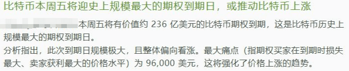 The news just revealed that this Friday, which is just around the corner, Bitcoin options worth $23.6 billion are set to expire! This is the largest event in Bitcoin's history, bar none. More critically, this options set is overall 'bullish', with a key price point called 'maximum pain' at $96,000. What does that mean?