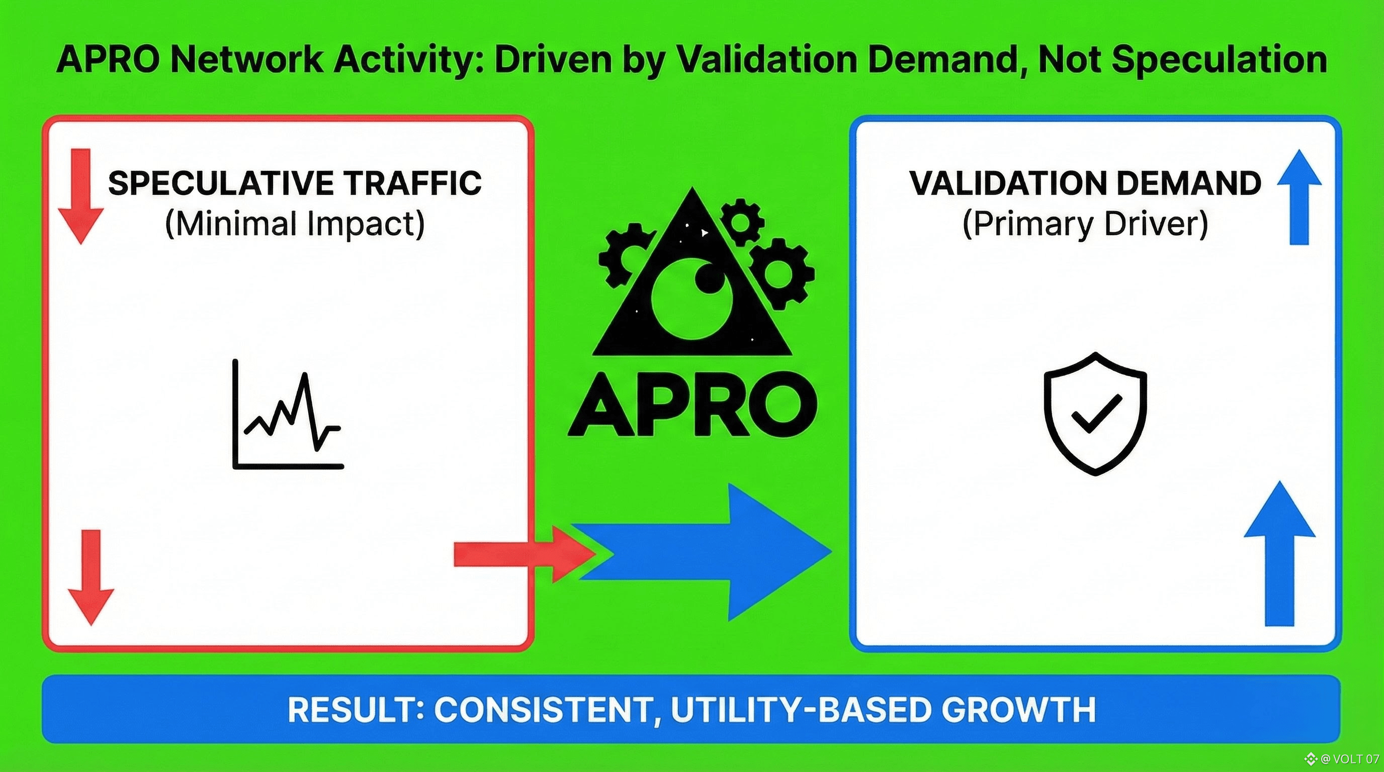 Speculative traffic has a certain energy to it. It arrives quickly, leaves just as fast, and tends to cluster around moments of excitement rather than moments of necessity. Validation demand feels very different. It’s quieter. More repetitive. Less emotional. When you look closely at the recent network activity around APRO, what stands out isn’t the intensity of movement, but the consistency of purpose. This doesn’t look like a system being poked by traders. It looks like a system being used.