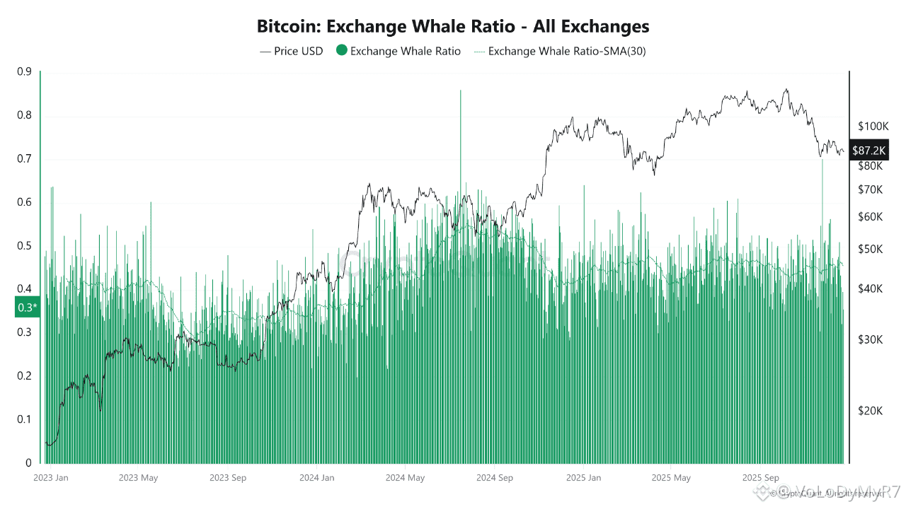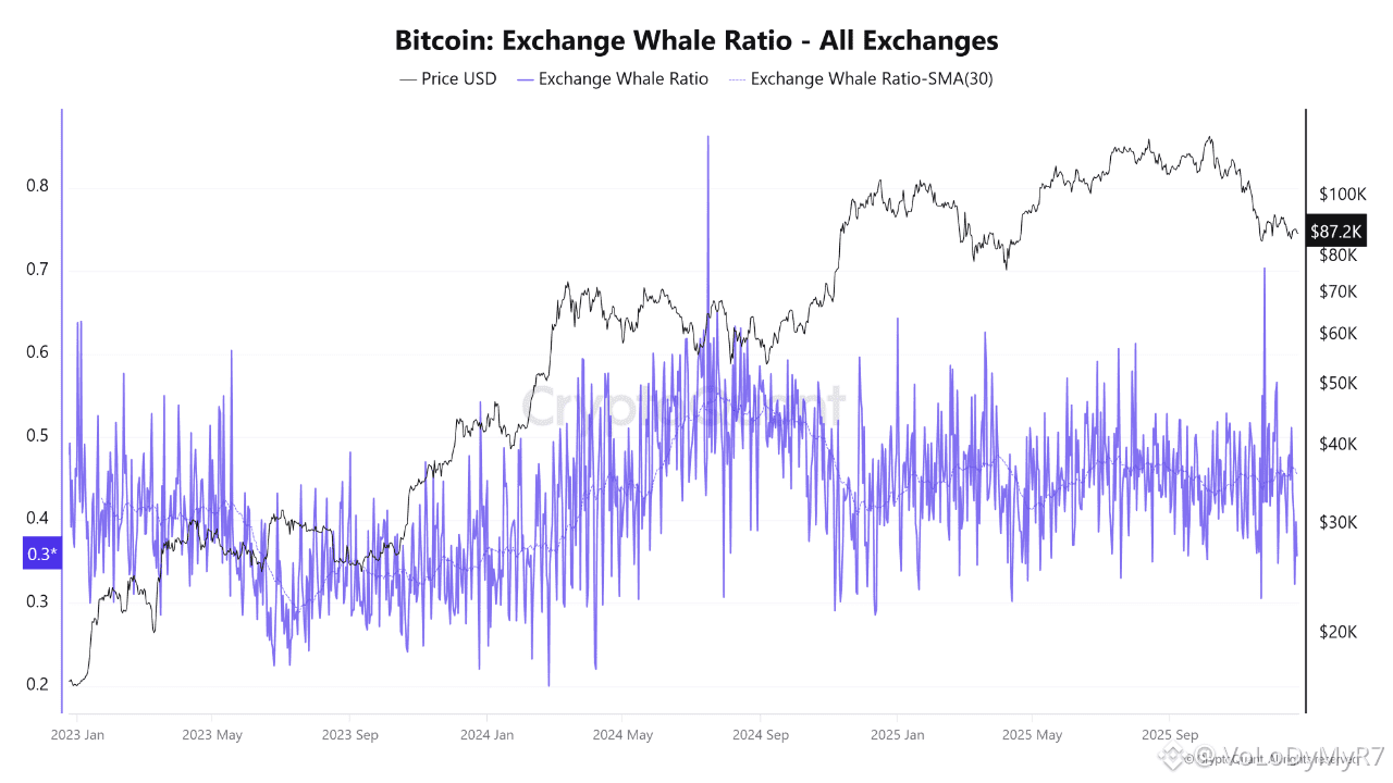Коефіцієнт китів на біржі на всіх біржах має тенденцію до зниження і стабілізується нижче нещодавніх локальних максимумів, в той час як ціна біткоїна консолідується на рівні $87K.