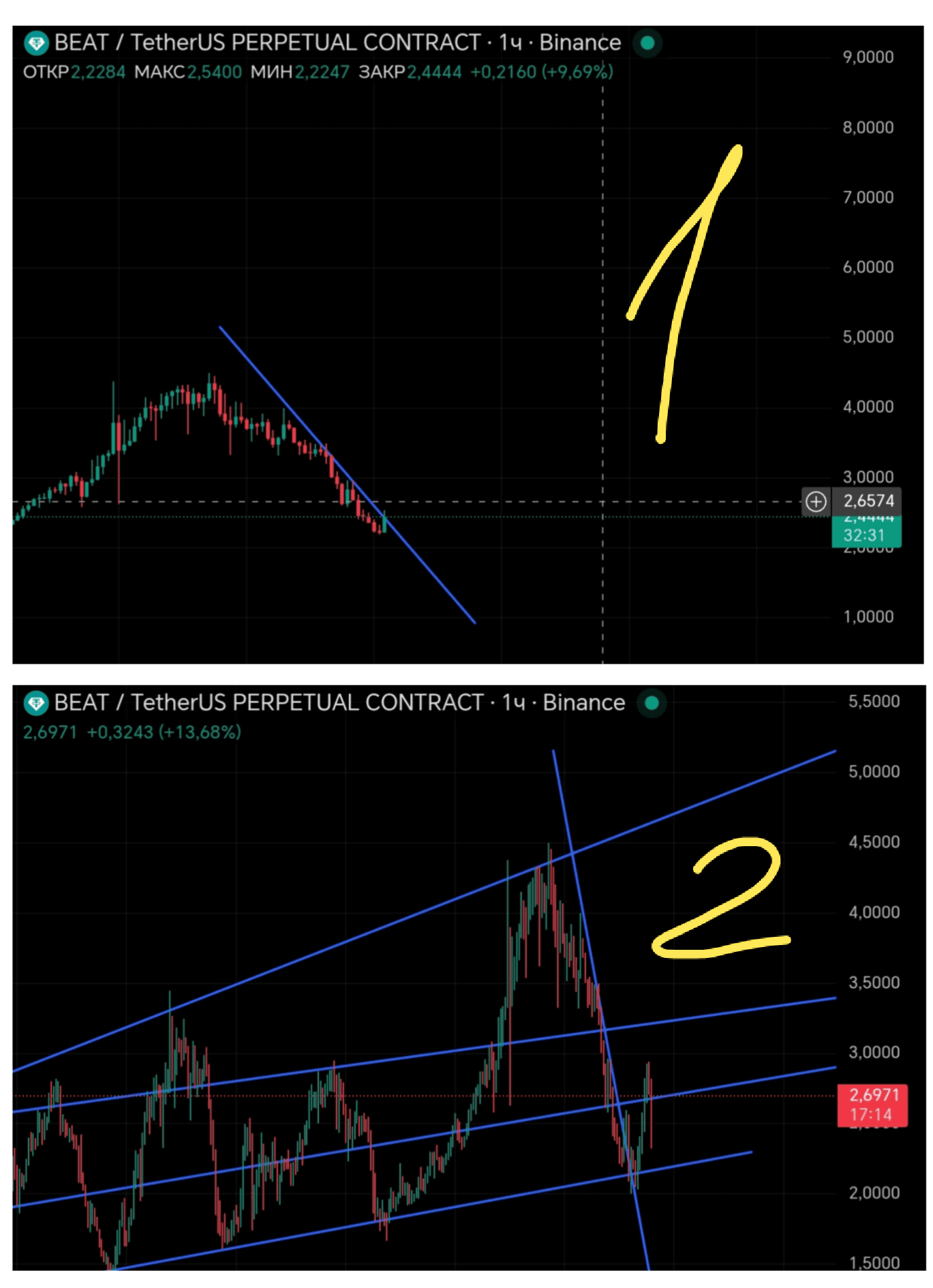 I decided not to rush and set a notification for 2.65, then it can be considered a reversal, already about 2 candles would have been above the trend line🙂