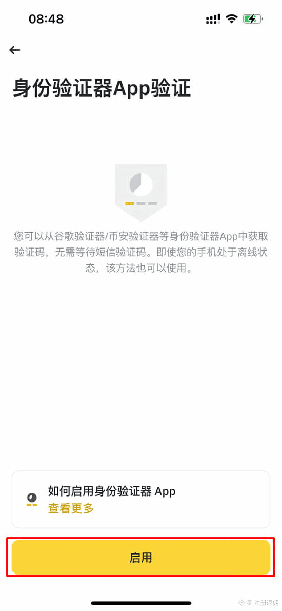 5. 确保您已经在手机上安装了 Binance Authenticator APP后,点击[启用]。