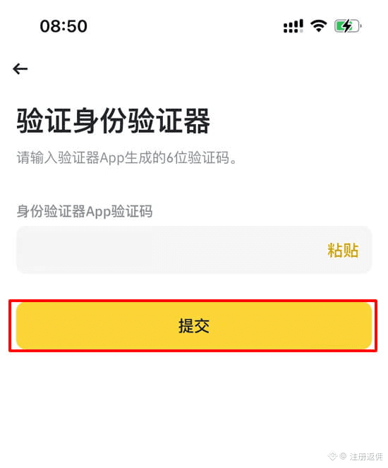 9. 返回币安APP,使用新启用的币安身份验证器验证您的设置请求。点击 [下一步],输入币安身份验证器中的 6 位数代码,然后点击 [提交]。