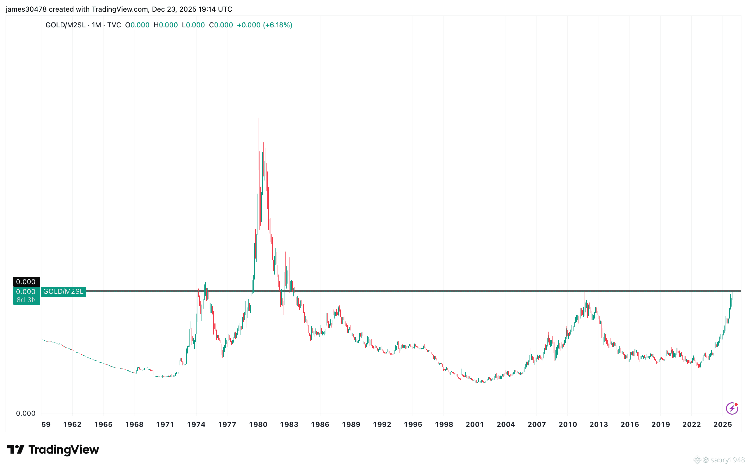 يقترب الذهب، عند قياسه مقابل المعروض النقدي الأمريكي (M2SL)، من اختبار مستوى مقاومة رئيسي لم يشهده منذ عام 2011. الأهم من ذلك، أن هذا المستوى نفسه لم يتم كسره بشكل حاسم إلا مرة واحدة في التاريخ الحديث خلال فترة الارتفاع الكبير في أواخر سبعينيات القرن العشرين، عندما تضاعف سعر الذهب أكثر من ثلاثة أضعاف.