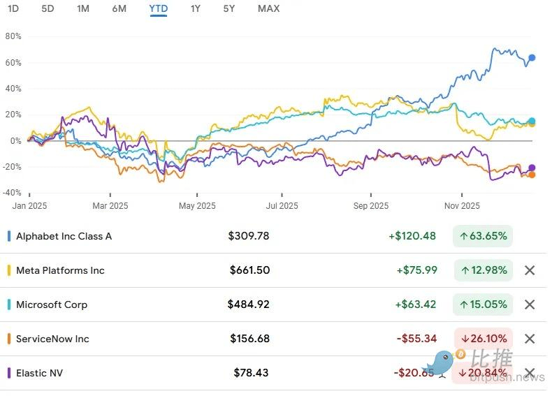 In the software and data fields, performance is differentiated along another dimension: (1) Mandatory vs. (2) Optional. Platform enterprise systems that embed workflows and mandate renewals (such as Alphabet and Meta) continue to grow compoundly, both having risen year-to-date, as AI expenditures strengthen their existing distribution moats. ServiceNow and Datadog, despite strong product capabilities, have seen their returns dragged down by valuation pressure, bundling pressures from hyperscale cloud service providers, and slower AI monetization speeds. Elastic illustrates the adverse situation: strong technical capabilities, but squeezed by cloud-native alternatives, with unit economic returns deteriorating.