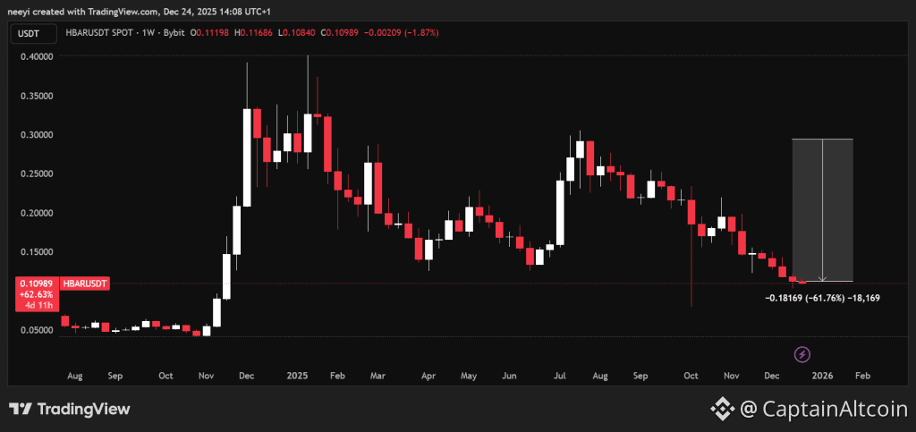 Despite the steady stream of institutional developments, HBAR price did not escape the broader market pressure that defined much of 2025. Like most altcoins, price action remained uneven throughout the year. HBAR is currently trading more than 50% above its January opening price, yet that performance still reflects a challenging market rather than a breakout phase.