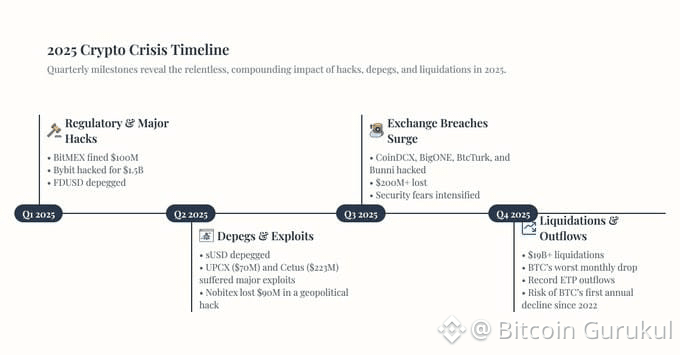 I've been through multiple crypto cycles now, and 2025 hit different. This wasn't just about prices going down – it was about fundamental failures of security, trust, and infrastructure.
