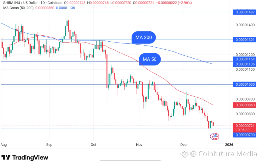 Shiba Inu began 2025 with a strong performance, opening at $0.00002113. The asset maintained a price above $0.00001 for nine consecutive months, even during corrections in May and June. However, conditions changed sharply in October following a market-wide flash crash that erased nearly $20 billion from leveraged crypto positions. Shiba Inu breached the critical $0.00001 support level during this event, falling to a low of $0.0000085.