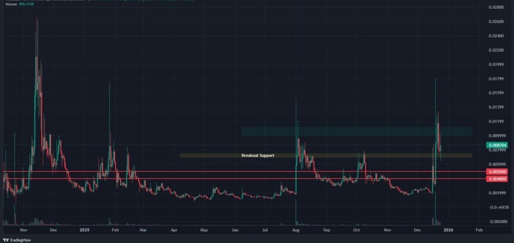 Holding above the $0.0070 to $0.0075 support zone keeps the path open for a retest of $0.0100, with possible extensions toward the $0.013 to $0.015 range and higher momentum targets near $0.018 to $0.020.