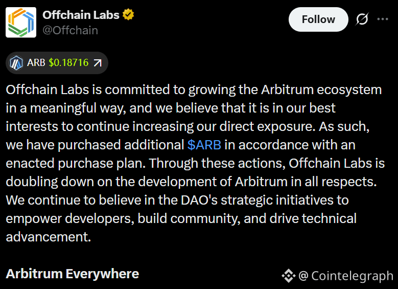 In a post on X this week, Offchain Labs said it remains “committed to growing the Arbitrum ecosystem in a meaningful way,” adding that it has increased its direct exposure to Arbitrum (ARB) under an approved purchase plan.