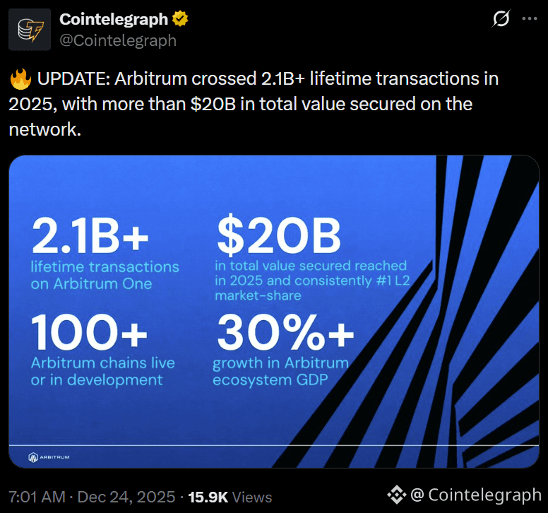 Arbitrum also reported reaching $20 billion in total value secured in 2025, consistently ranking as the largest Ethereum layer-2 by market share.