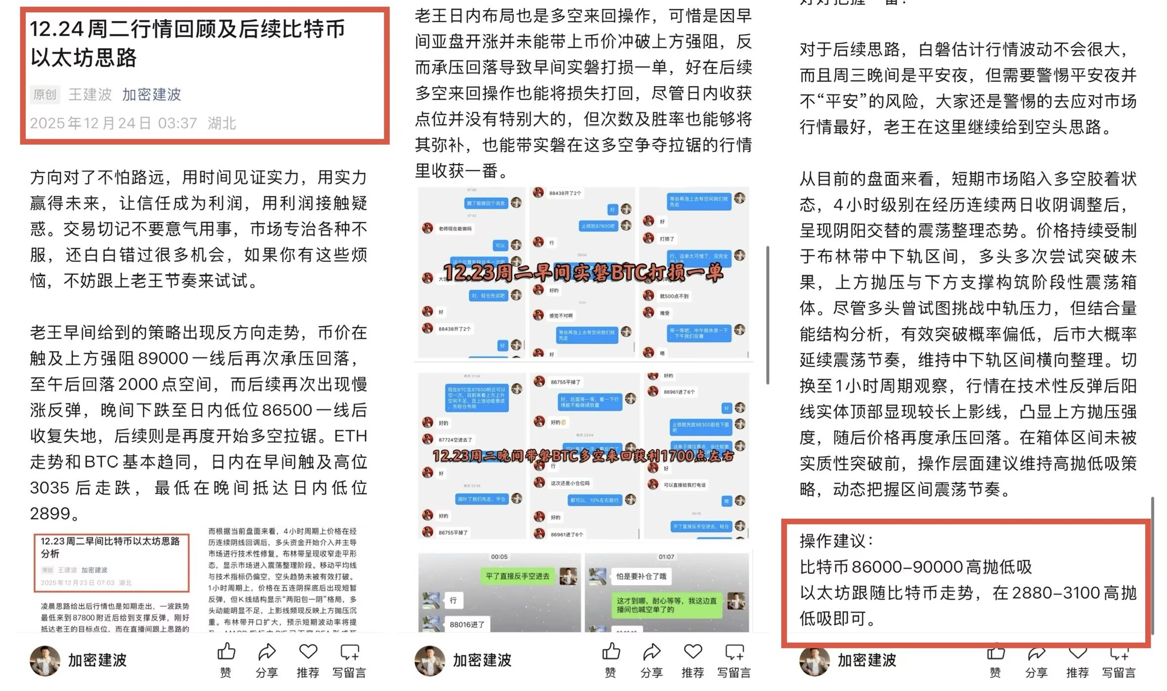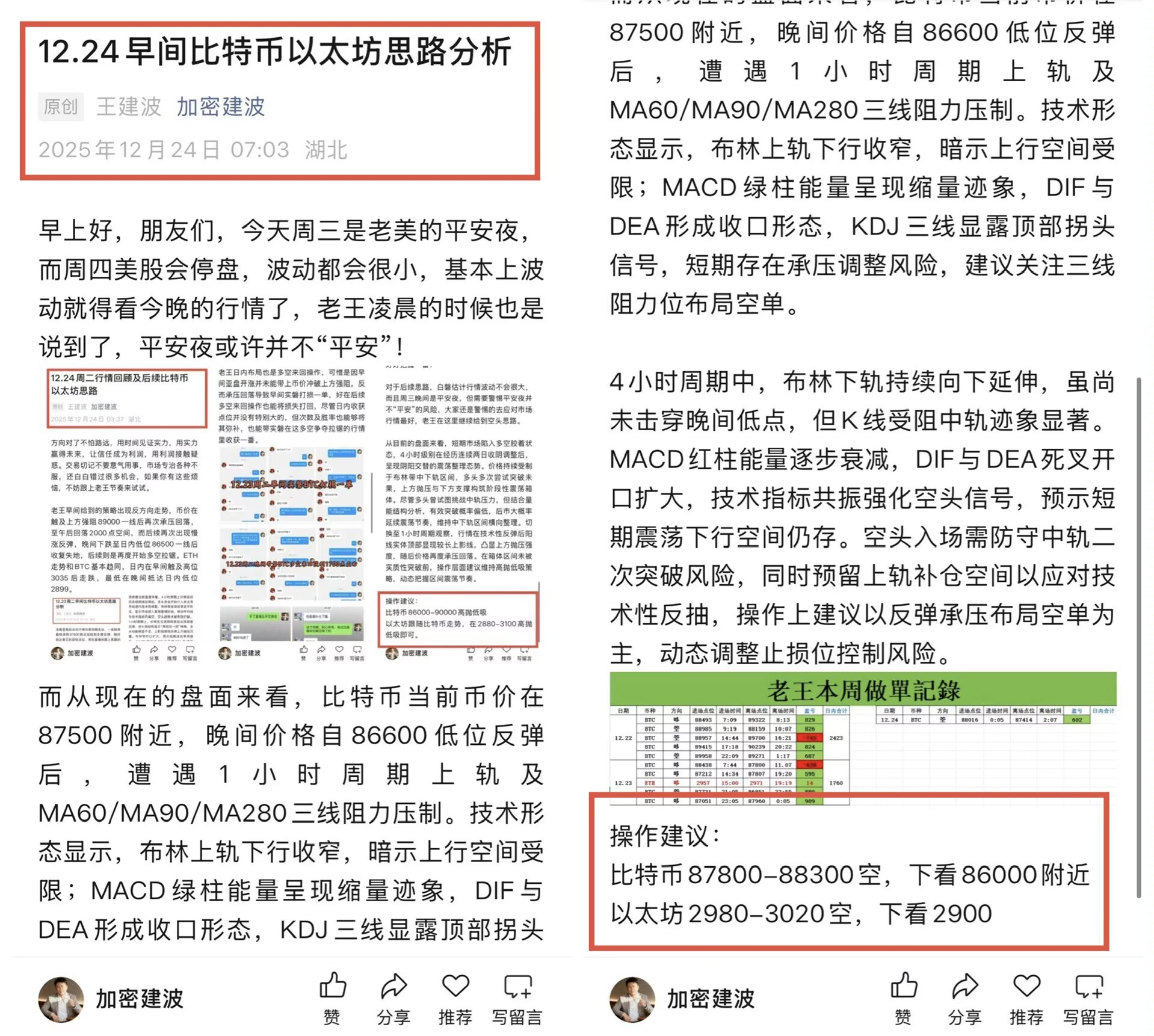 Old Wang's intraday short strategy has been perfectly validated by the market! Including the box range provided in the early morning, the market has perfectly validated it! The intraday BTC market rose to around 88000 after the early morning, then faced pressure and fell back to the early morning high of 88349. In the evening, it found support at 86500, showing a slight rebound. After the opening of the evening US stocks, it continued to decline, reaching the intraday low of 86355 before rebounding. Currently, it is hovering around 87300. ETH's trend moves in sync with BTC's trend, with an intraday high of 2987 in the early morning and an evening low of 2886.