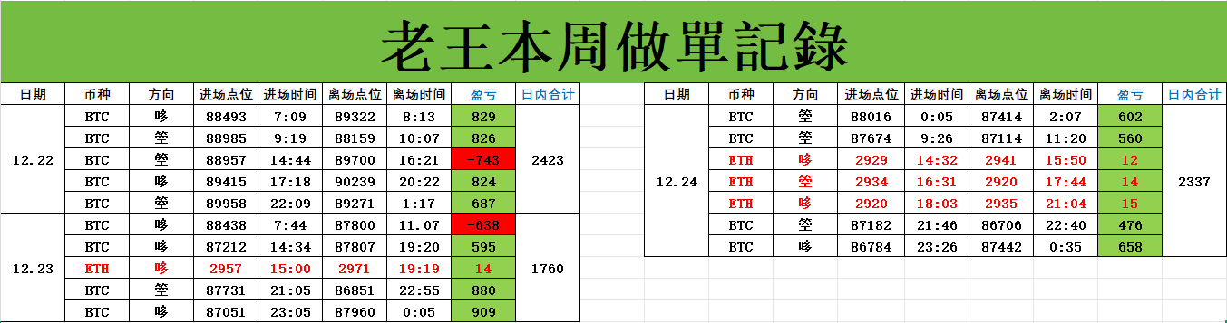 Due to the slow movement of the intraday market, Lao Wang has made more intraday positions, totaling 4 BTC and 3 ETH, achieving a total of 2337 points. There hasn't been much significant profit, so I'll share the last intraday trade with you.