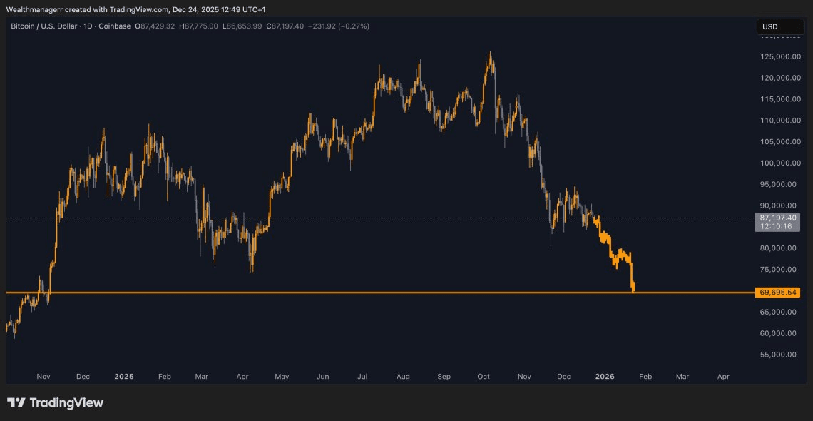 The fractal that sank Bitcoin in the winter of 2021 has just awakened, and if history repeats itself with the precision of a Swiss watch, we are peering over a cliff of $70,000. 📉 Currently, Bitcoin is struggling to maintain balance at $87,370, having already lost 30% of its value since that glorious peak of $126,000. The atmosphere in the market feels heavy, like that tense calm before an electric storm, because we are seeing a mirror pattern: on December 24, 2021, the price brushed against $51,700 only to plummet 34% in just 30 days. 📅
