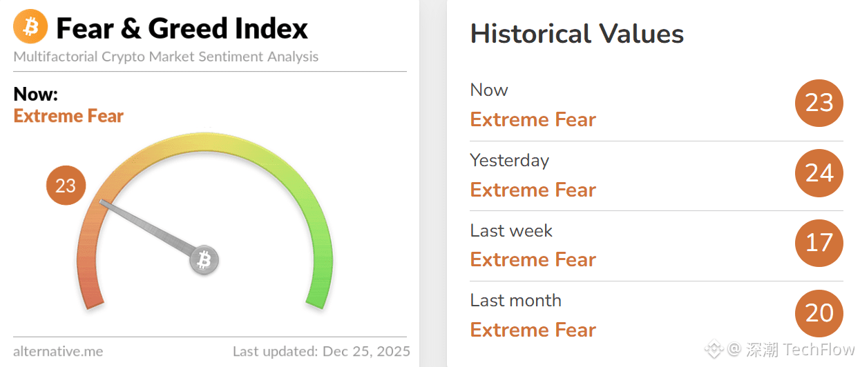 深潮 TechFlow 消息,12 月 25 日,据 Alternative.me 数据,今日加密货币恐慌与贪婪指数降至 23(昨日该指数为 24),表明市场仍处于「极度恐慌态」。