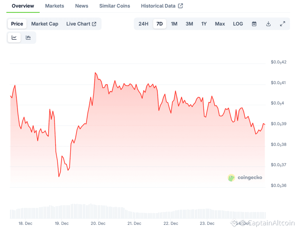 Pepe trades at $0.00000392 with a $1.65 billion market cap, down nearly 3% over seven days while underperforming both the broader market and Ethereum ecosystem tokens. The original 2023 meme sensation faces real headwinds affecting the Pepe coin price prediction.
