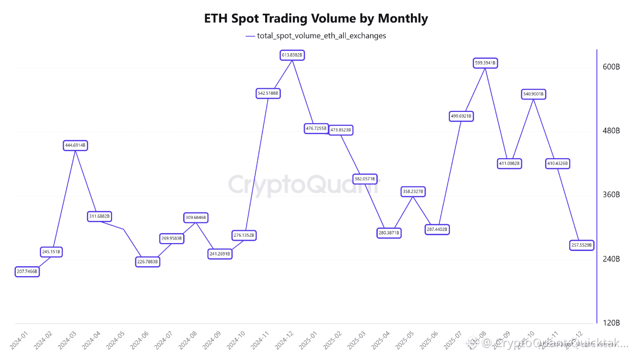 Ethereum markets saw a significant drop in spot trading volume in December, reaching $257.5 billion, the lowest level since 2024 This decline indicates a decrease in activity among traders and investors, with most participants likely adopting a long-term strategy or awaiting strong signals before making new trading decisions.