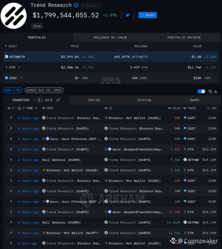 Investment firm Trend Research has an open long spot position on Ethereum ETH $2 935 24h volatility: 0.6% Market cap: $354.75 B Vol. 24h: $27.12 B at a nominal value of approximately $1 billion by depositing ETH collateral, borrowing stablecoins, buying Ether, and redepositing it on Aave AAVE $151.1 24h volatility: 2.6% Market cap: $2.30 B Vol. 24h: $225.42 M for a leveraged, high-conviction play.
