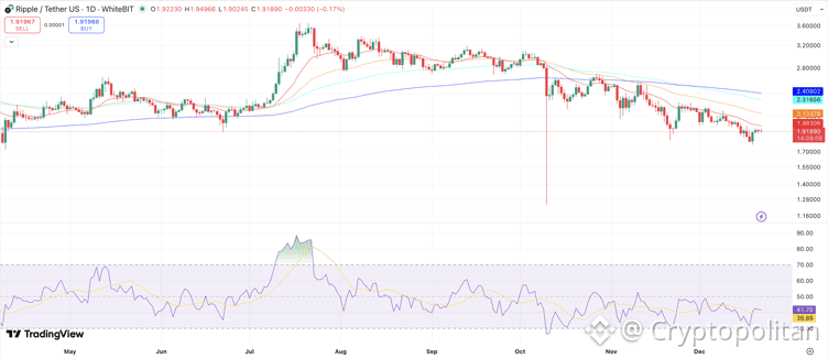 However, the on-chain whale activity statistics indicate a definitive return, as the number of accounts holding 100,000,000 to 1,000,000,000 XRP has cumulatively gathered sufficient supply to near-approach 12.8%, a classic function of coordinated whale buying as a result of a mid-session dip. However, even in this case, the prices are simply range-bound between the figures of $1.90 and $1.94, which lies beneath all the critical EMA levels and is marked by a deceleration of selling activity as indicated by an RSI of 43, a flat OBV, and the MACD being in the negative region.