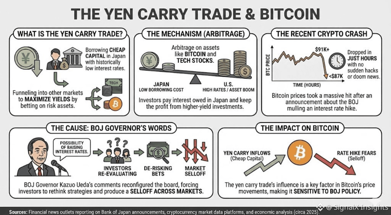 • When yen is cheap to borrow (low Japanese rates) and USD/JPY is rising, investors borrow in yen and deploy proceeds into higher-yield/risk assets (stocks, crypto). Analysts reported that after BOJ moves in Dec 2025, yen weakness helped sustain carry trades, which supported BTC near $87–$90k ranges. This is a primary transmission channel.