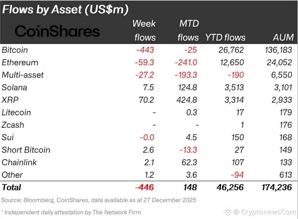 ETF flows line up with the price action, as a CoinShares report noted that digital asset products saw $446 million in outflows in the week to December 29, with Bitcoin products losing $443 million and total post‑October 10 outflows hitting $3.2 billion.