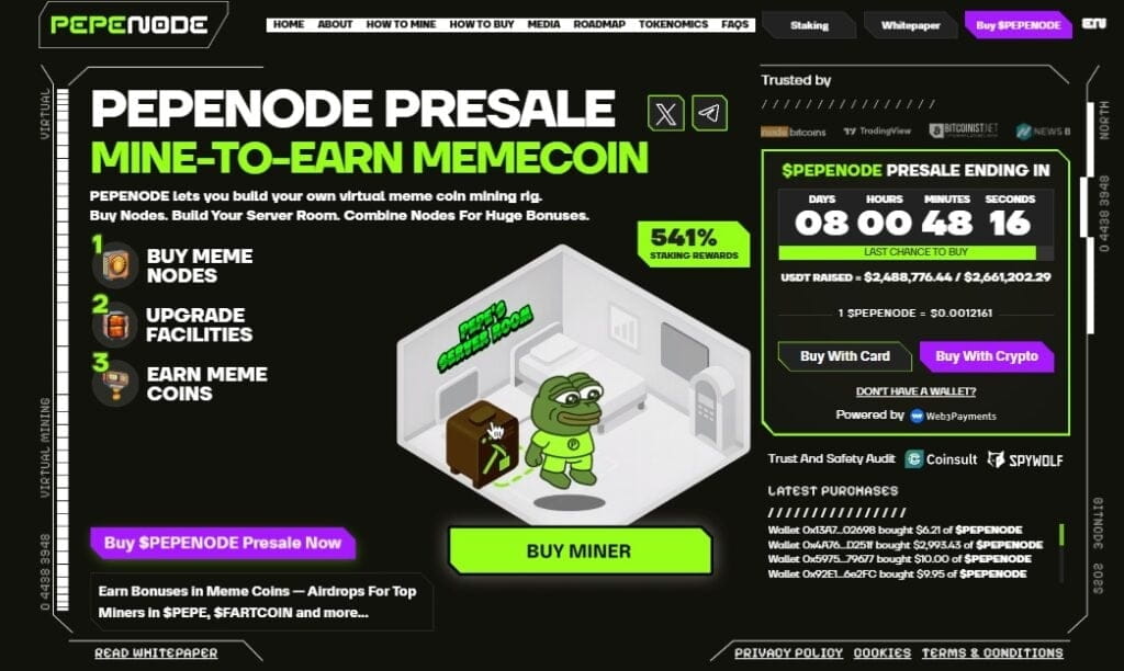 Pepenode is a mine-to-earn meme coin project that allows users to build and upgrade virtual mining rigs using $PEPENODE tokens. The current presale has already raised over $2.4 million, with only 8 days left before it concludes.