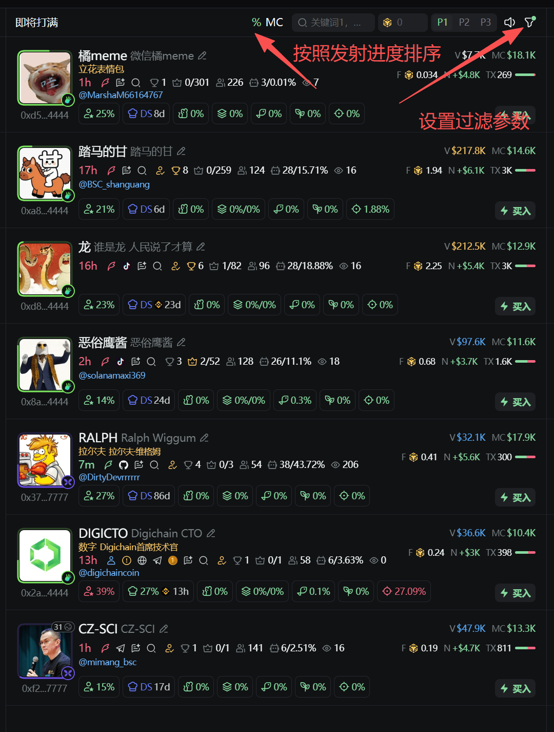 Let me share my thoughts; I don't easily jump into doge memes, at least a few hundred U positions. Due to limited time and energy, I only focus on the internal market that is close to filling up, filtering parameters: