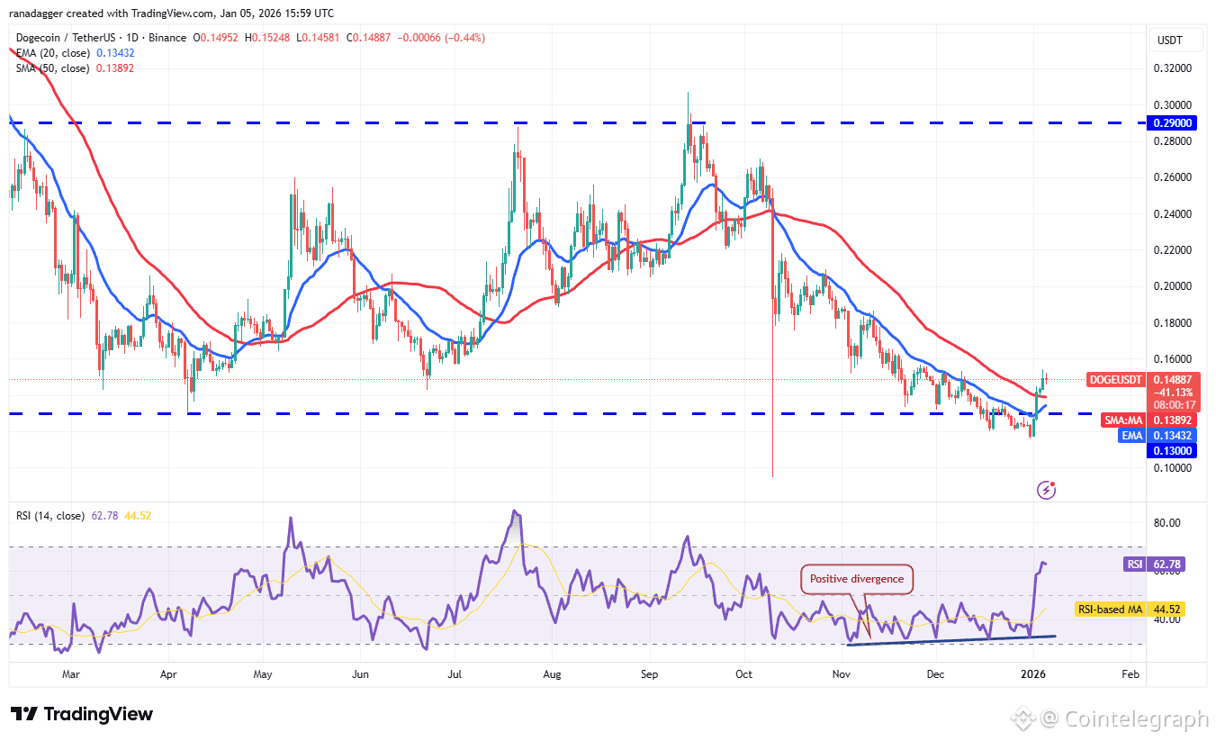 Any pullback is expected to find support at the 20-day EMA and then at the $0.13 level. Sellers will have to yank the DOGE/USDT pair below the $0.11 level to regain control. The pair may then drop to $0.10.