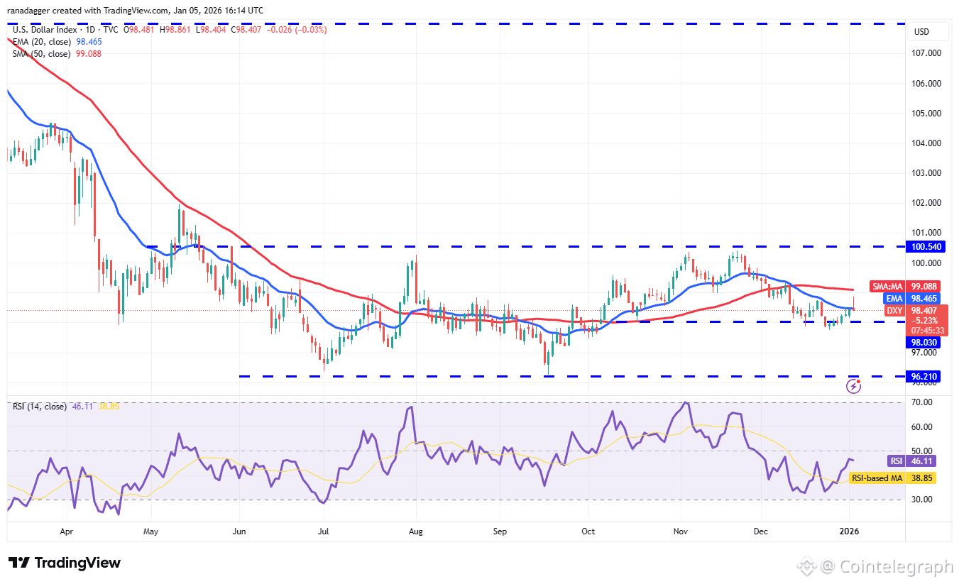 The US Dollar Index (DXY) rose above the 20-day exponential moving average (98.46), but the long wick on the candlestick shows selling near the 50-day SMA (99.08).