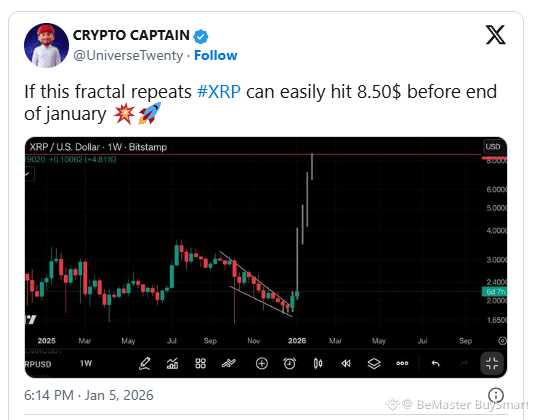 $XRP Interest around XRP has intensified following a post from crypto analyst Crypto Captain (@UniverseTwenty). He focused on a fractal visible on the weekly XRP chart. The setup points to a potential sharp upside move into late January.