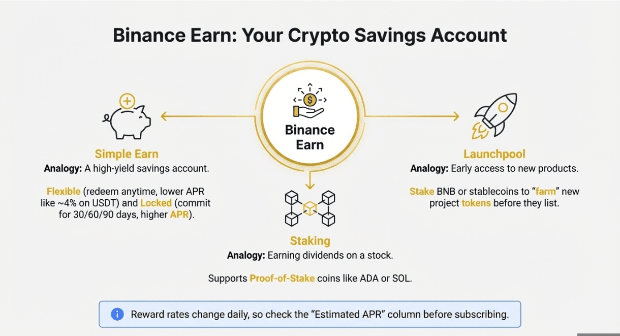 Money in a bank savings account earns interest; Binance Earn tries to do the same for crypto. Under Earn > Simple Earn you will see Flexible and Locked products. A Flexible position in USDT may pay around 4 % annualized and lets you redeem anytime. Locked products might pay more for committing 30 , 60 , or 90 days.
