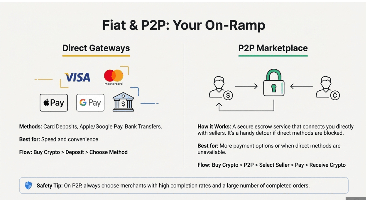 If your bank blocks card-based crypto buys, the P2P marketplace is a handy detour. It matches buyers and sellers directly and holds the seller’s coins in escrow until payment is confirmed, adding a safety net.