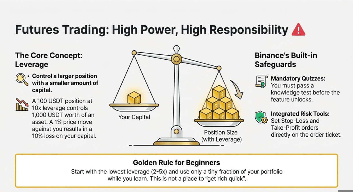 On Binance Futures you can go long or short with up to 125x leverage, although beginners usually start at 2-5x. Opening a 100 USDT position at 10x means you control 1 000 USDT worth of contracts, so a 1 % move in price translates to 10 % on your capital. Built-in quizzes must be passed before the feature unlocks, and stop-loss/take-profit fields appear right on the order ticket for risk control.