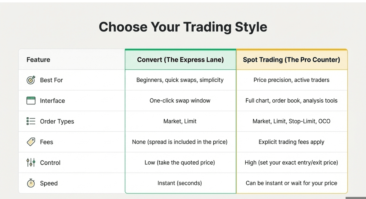 Think of Convert as the express checkout lane. You choose the coin you have, pick the coin you want, preview the real-time price, confirm, and you are done in seconds. No charts, no order books, no fees for basic use.