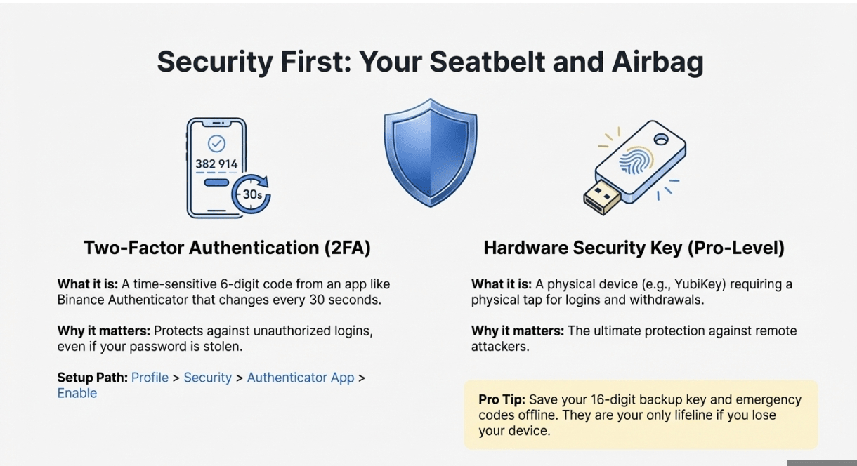 Before the first trade, switch on Two-Factor Authentication (2FA). Binance Authenticator generates a 6-digit code that changes every 30 seconds. Pairing a small hardware key such as YubiKey adds a physical tap requirement for logins and withdrawals, blocking remote attackers even if they know your password.